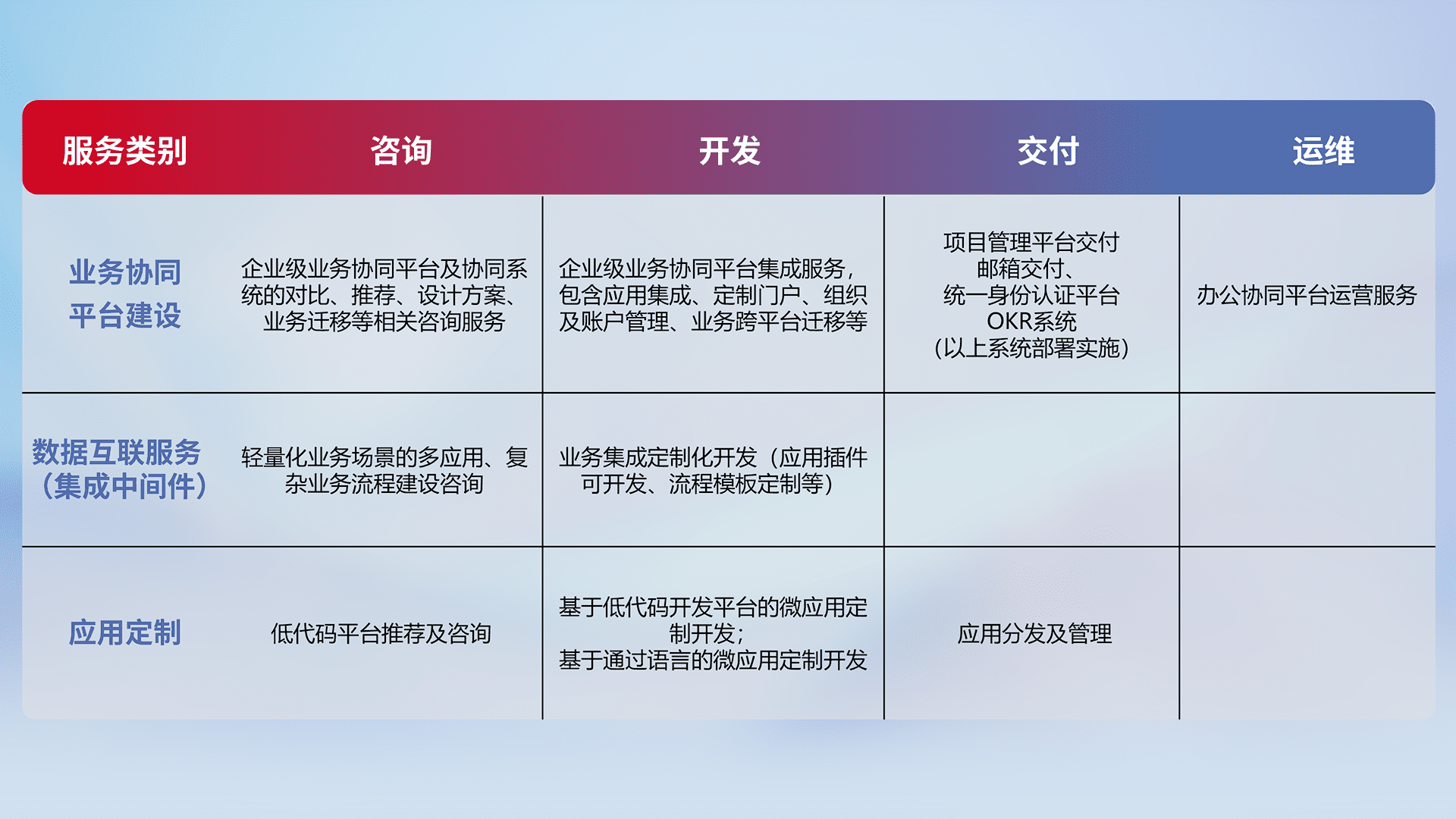 针对钉钉、、企微、、、IDaas等平台级产品提供产品的规划、、方案、、、交付、、、定制化开发等服务,,,实现如统一协同办公、、、智能客户服务、、、混合会议管理、、、、智能数据查询、、、等业务场景,,,实现数字化转型。。。