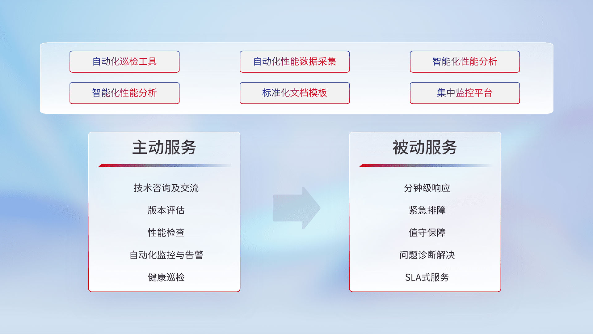 智能化工具和标准化文档,,,保障服务质量,,,,提供主动服务(包含技术咨询、、版本评估、、、、性能检查、、、自动化监控与告警、、健康巡检)和被动服务包含(分钟级响应、、、、紧急排障、、、值守保障、、、问题诊断解决、、、SLA服务)。。。。